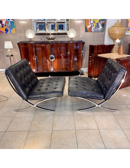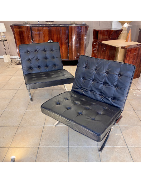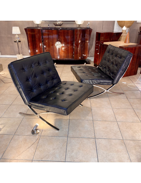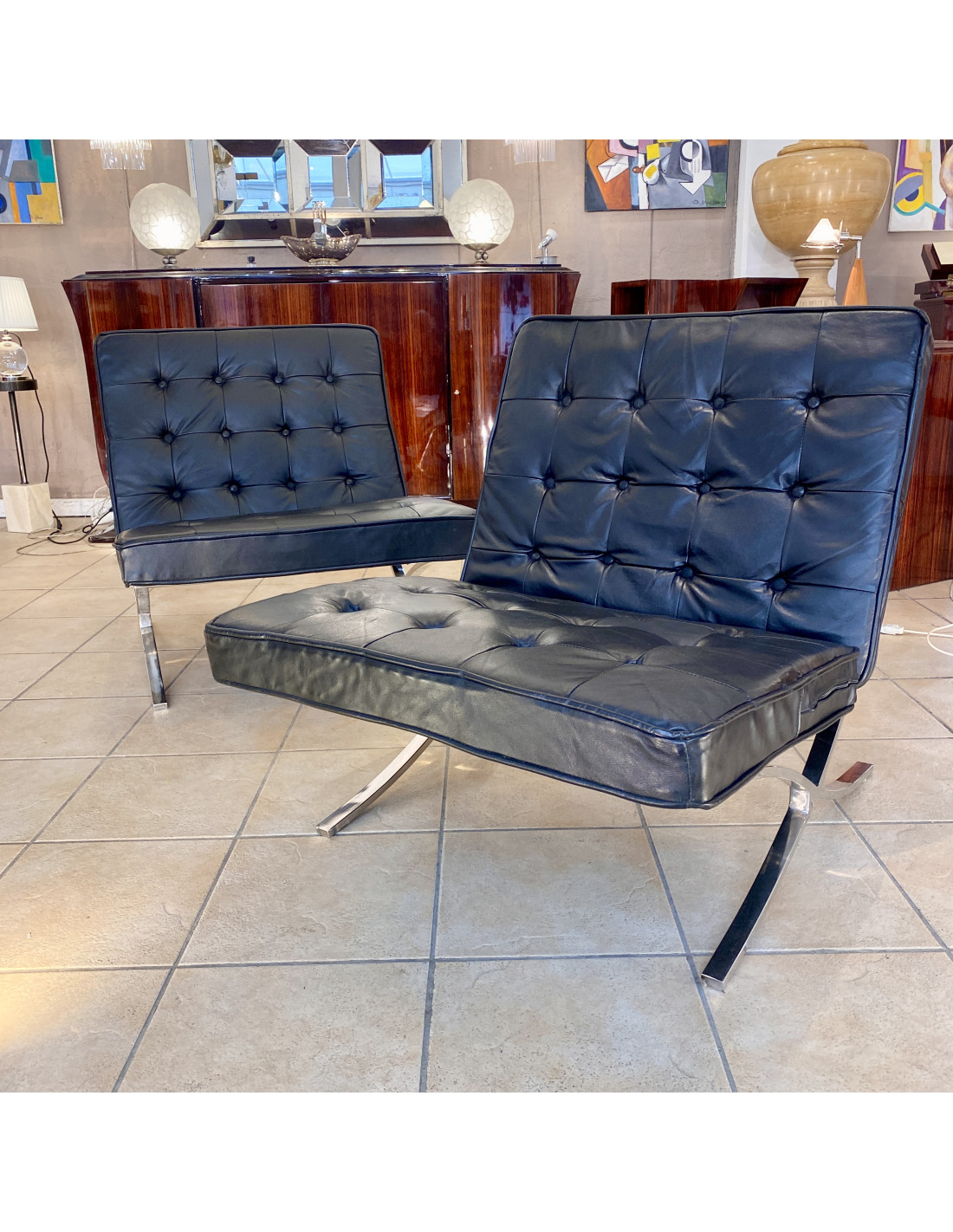 Paire de fauteuils "Barcelona"en cuir noir de Van Der Rohe d'époque 1970